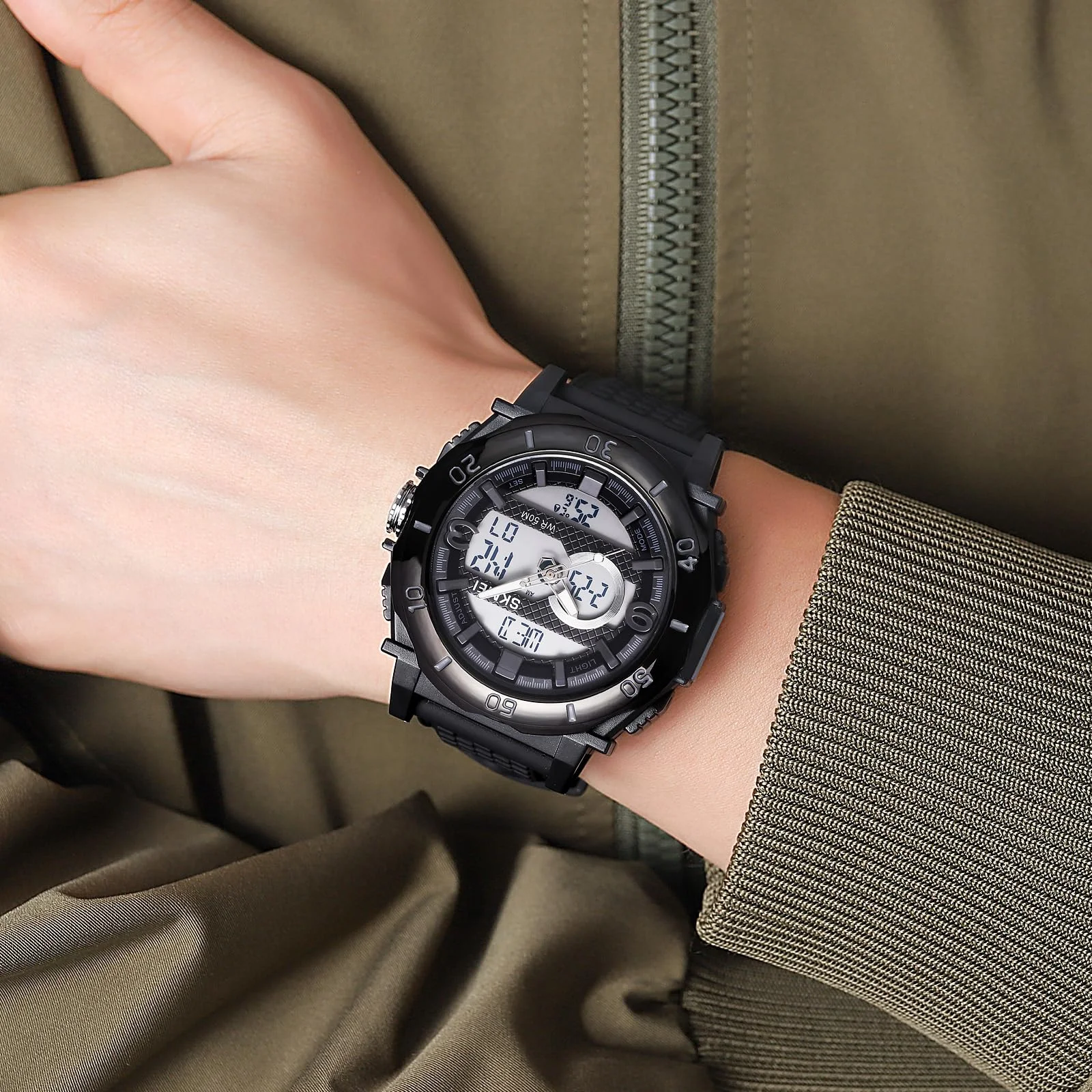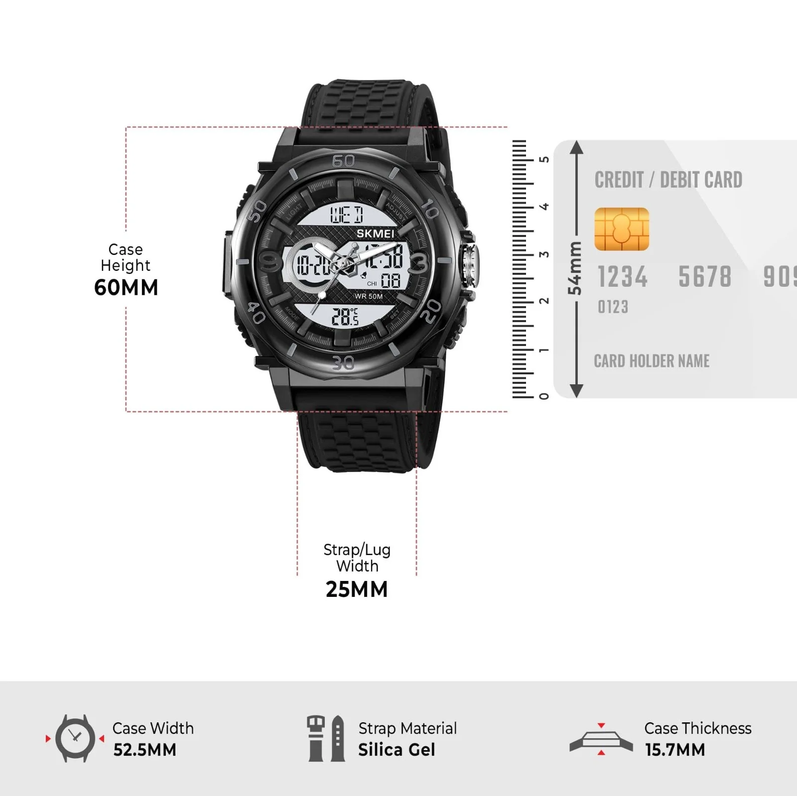 3Time, Chrono, Alarm, Date, Week, EL Light, 12/24 Hour Clock, Countdown, Thermometer📏 Case Size: 60 × 52.5mm | Thickness: 15.7mm