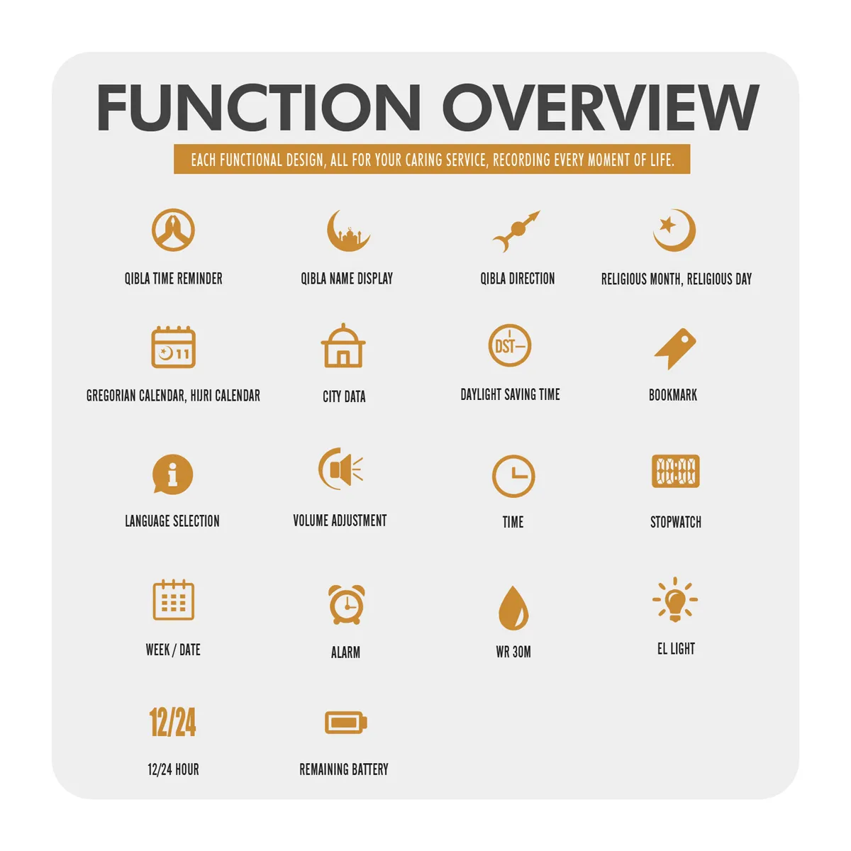 Pilgrimage Time Reminder • Qibla Name Display • Qibla Direction • Religious Month/Day • Gregorian & Hijri Calendar • City Data • Summer Time • Bookmark • Language Selection • Volume Adjustment • Remaining Battery Time • Chrono • Alarm • Date • Week • EL Light • 12/24 Hour Clock