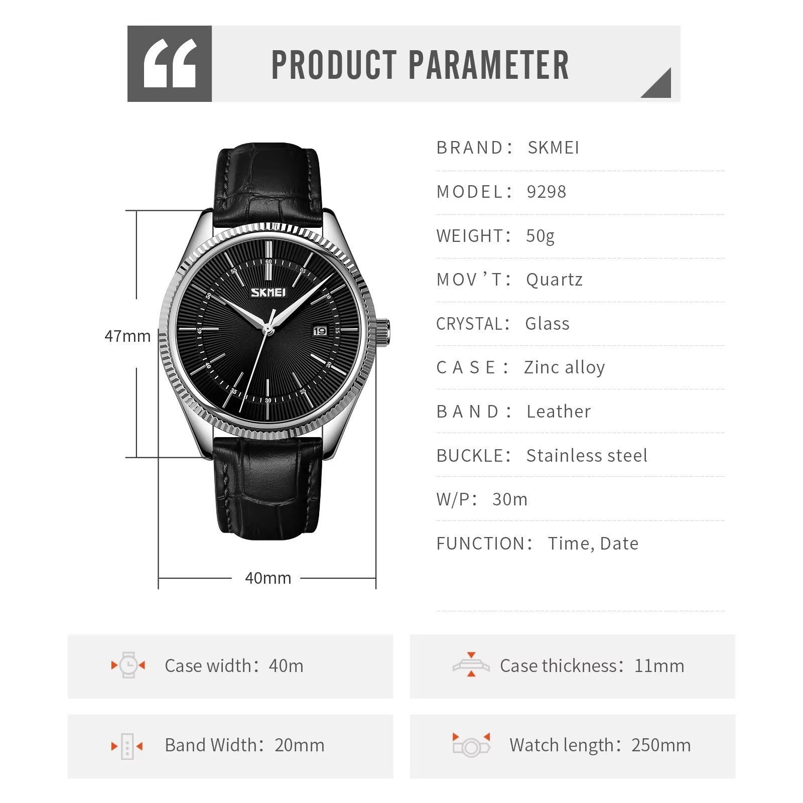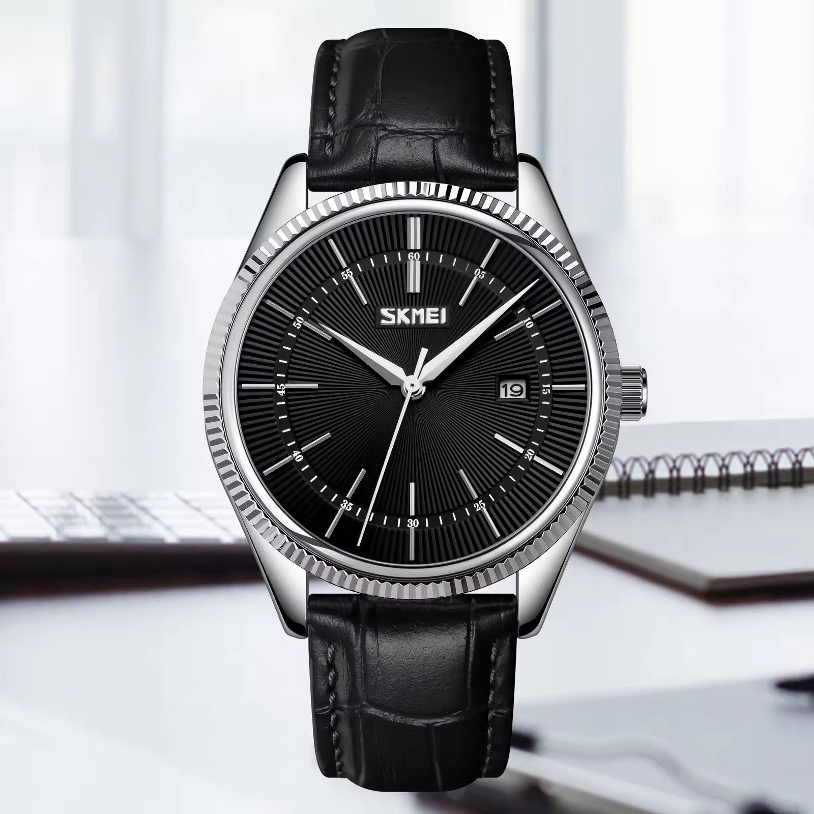 Skmei – 9298 – Leather Strap Analog Quartz Watch – Silver/Black-Black