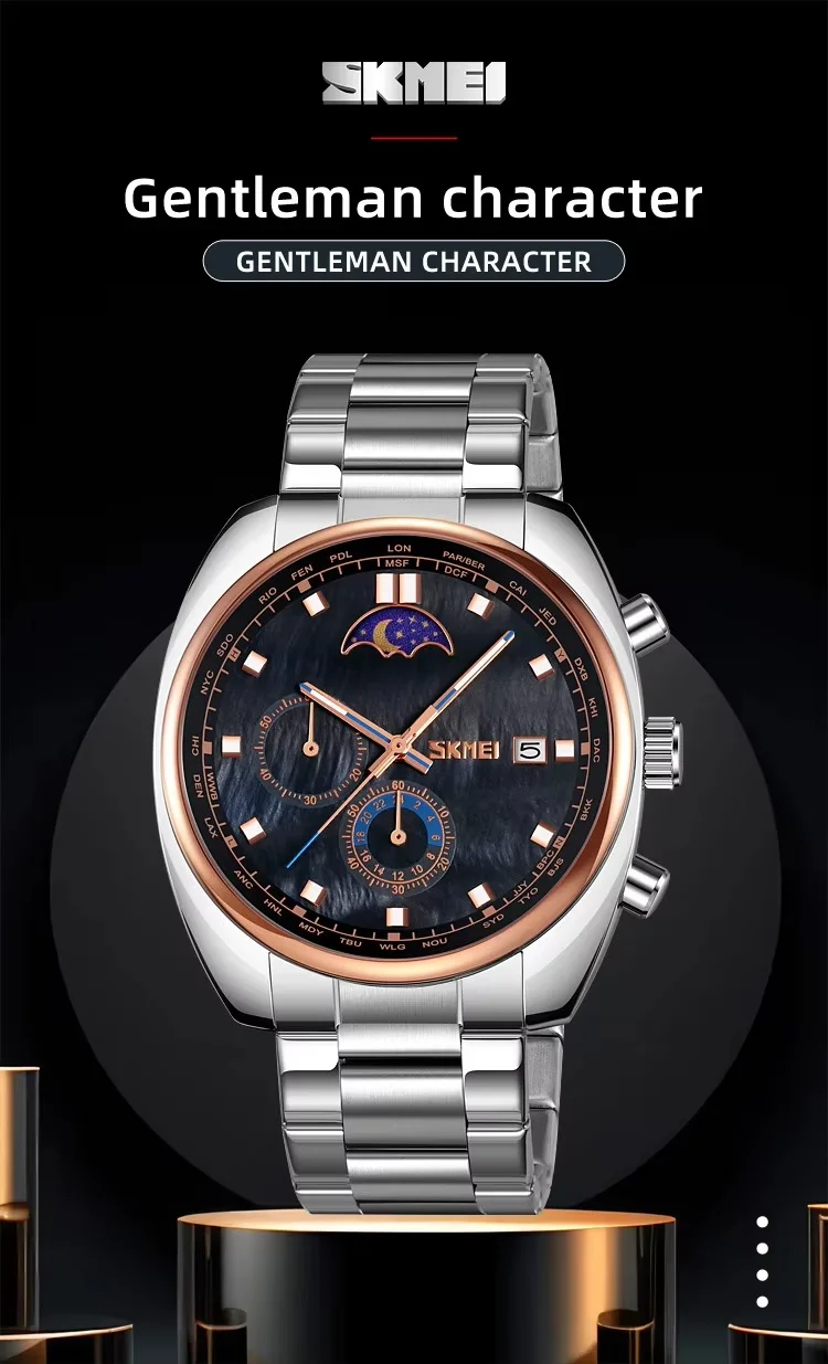 SKMEI – 9325 – Quartz Luxury Moon Phase Chrono Watch – RoseGold/Black