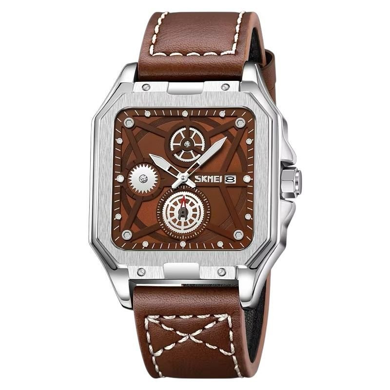 SKMEI – 9330 – Premium Down Second Square Dial Watch – silver/brown